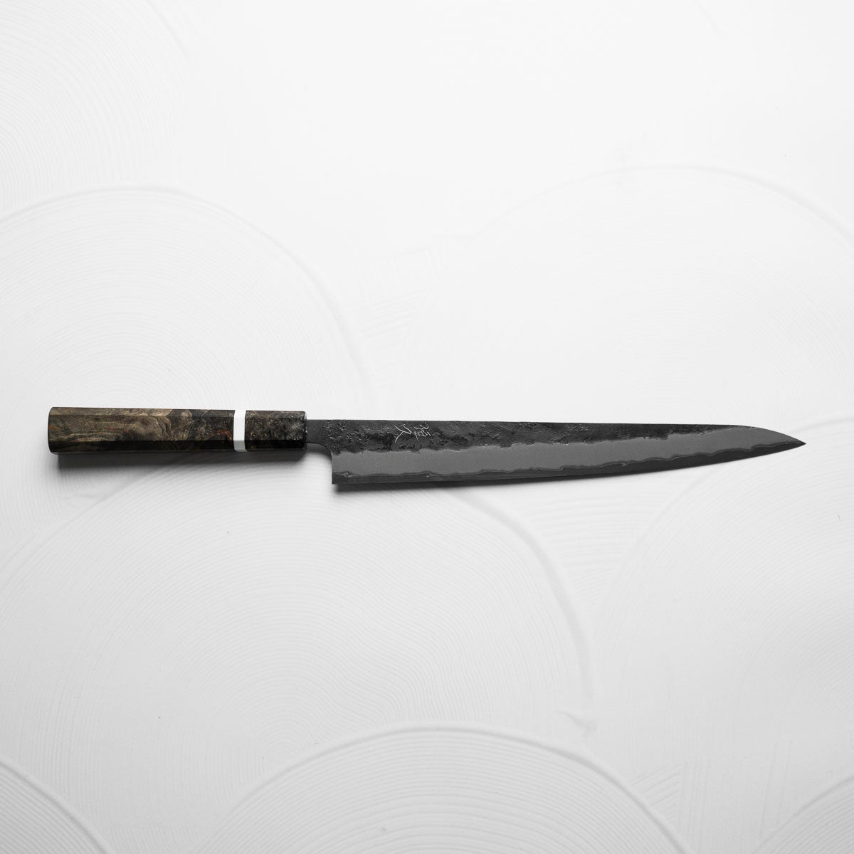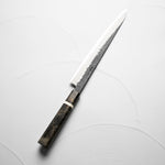 The Sujihiki knife, a traditional Japanese slicer, is designed for carving and fileting. With its long, narrow blade, typically ranging from 240mm to 330mm, it excels in creating clean, smooth cuts through meat and fish. Its length ensures long, uninterrupted strokes, making it perfect for precise slicing tasks.