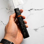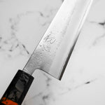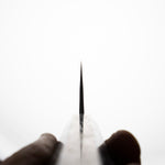One of their most celebrated offerings is the SKD steel series — featuring a semi-stainless high-carbon core clad in stainless steel. The blades showcase a distinctive wide-bevel grind with a shallow hammer texture that sits stylistically between nashiji and kurouchi finishes. Paired with traditional burnt chestnut handles, each knife reflects Yoshikane’s dedication to consistency, craftsmanship, and timeless design.