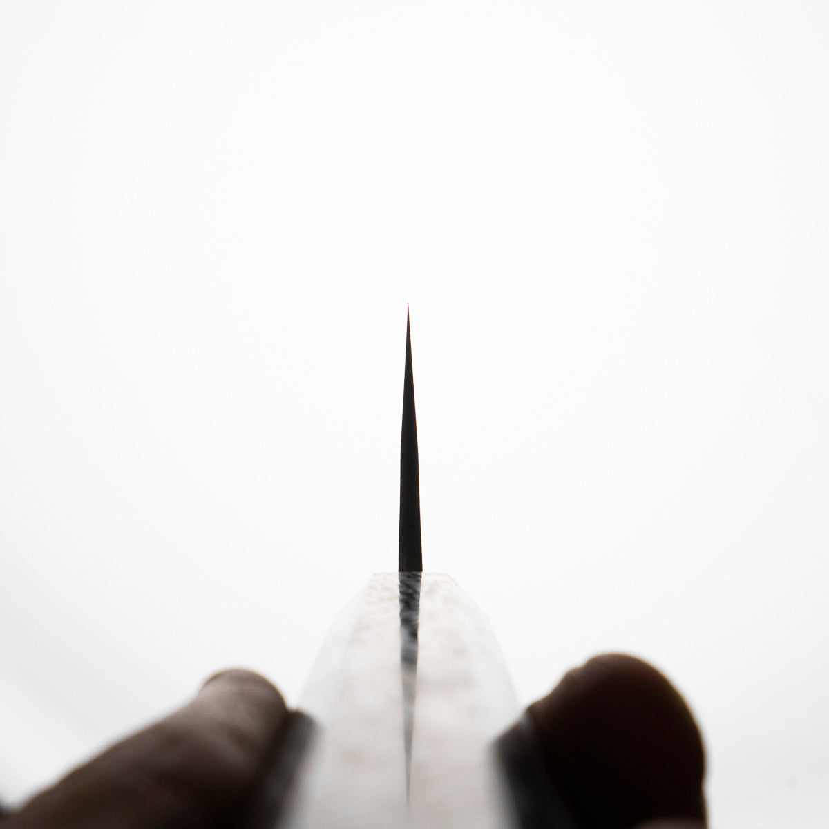 Japanese White Steel #2, a traditional high-carbon steel, is cherished for its purity and fine grain structure, enabling razor-sharp edges, at the cost of being reactive. It is one of the easiest steels to sharpen, but cannot be left wet for even short periods otherwise rust spots can occur. If you’re fastidious in your knife maintenance, this knife steel can be extremely rewarding to use.