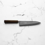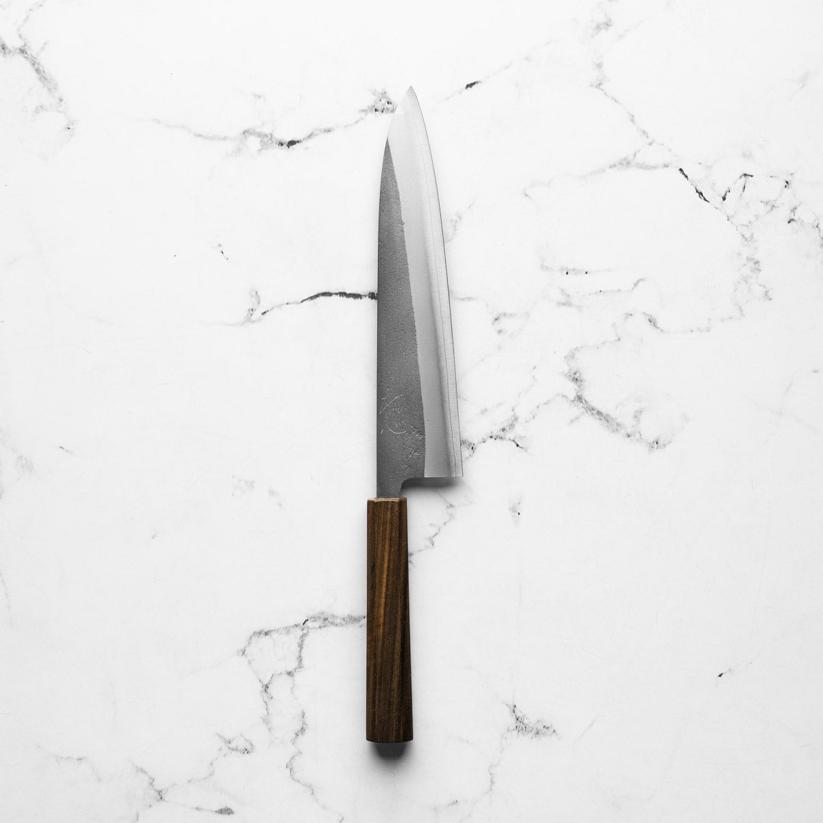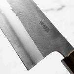 One of their most celebrated offerings is the SKD steel series — featuring a semi-stainless high-carbon core clad in stainless steel. The blades showcase a distinctive wide-bevel grind with a shallow hammer texture that sits stylistically between nashiji and kurouchi finishes. Paired with traditional burnt chestnut handles, each knife reflects Yoshikane’s dedication to consistency, craftsmanship, and timeless design.