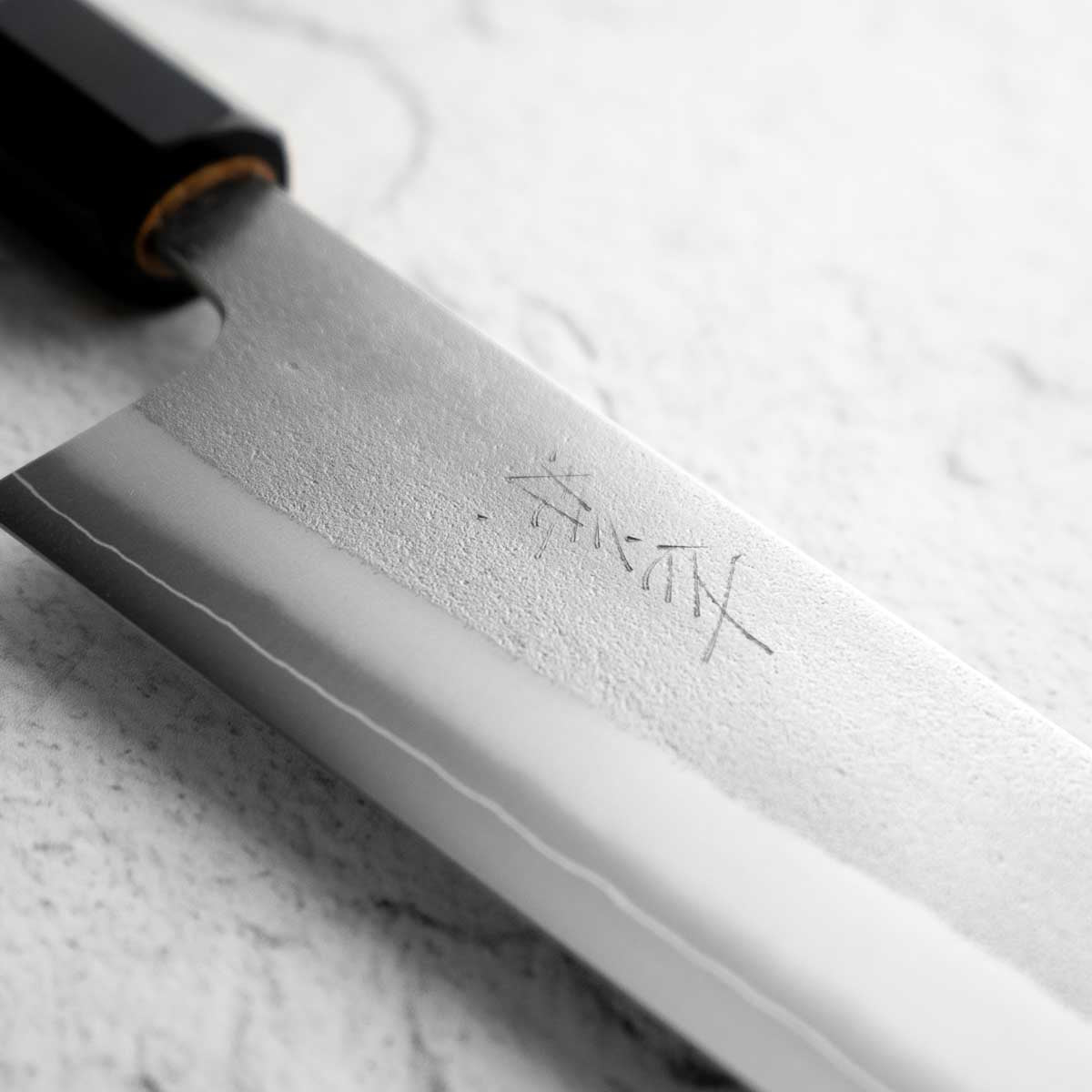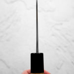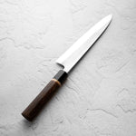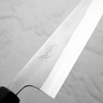 One of their most celebrated offerings is the SKD steel series — featuring a semi-stainless high-carbon core clad in stainless steel. The blades showcase a distinctive wide-bevel grind with a shallow hammer texture that sits stylistically between nashiji and kurouchi finishes. Paired with traditional burnt chestnut handles, each knife reflects Yoshikane’s dedication to consistency, craftsmanship, and timeless design.