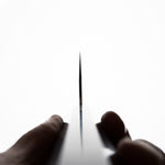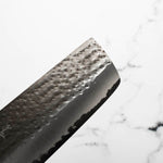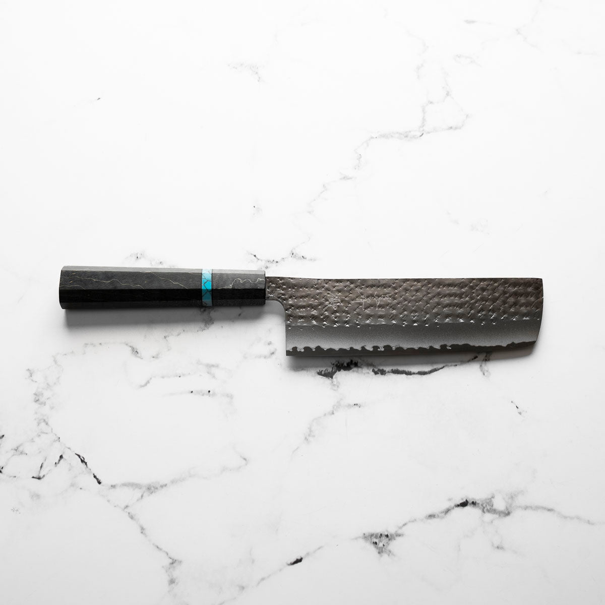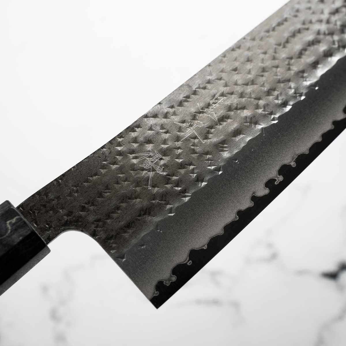 His knives are instantly recognizable for their striking Tsuchime and Suminagashi finishes, thin grinds, and use of high-performance steels such as SG2, HAP40, and stainless-clad Blue Super. Kurosaki’s Fujin series, with its dramatic wind-patterned hammer finish, helped cement his reputation as a blacksmith who blends artistry and technical brilliance in equal measure.