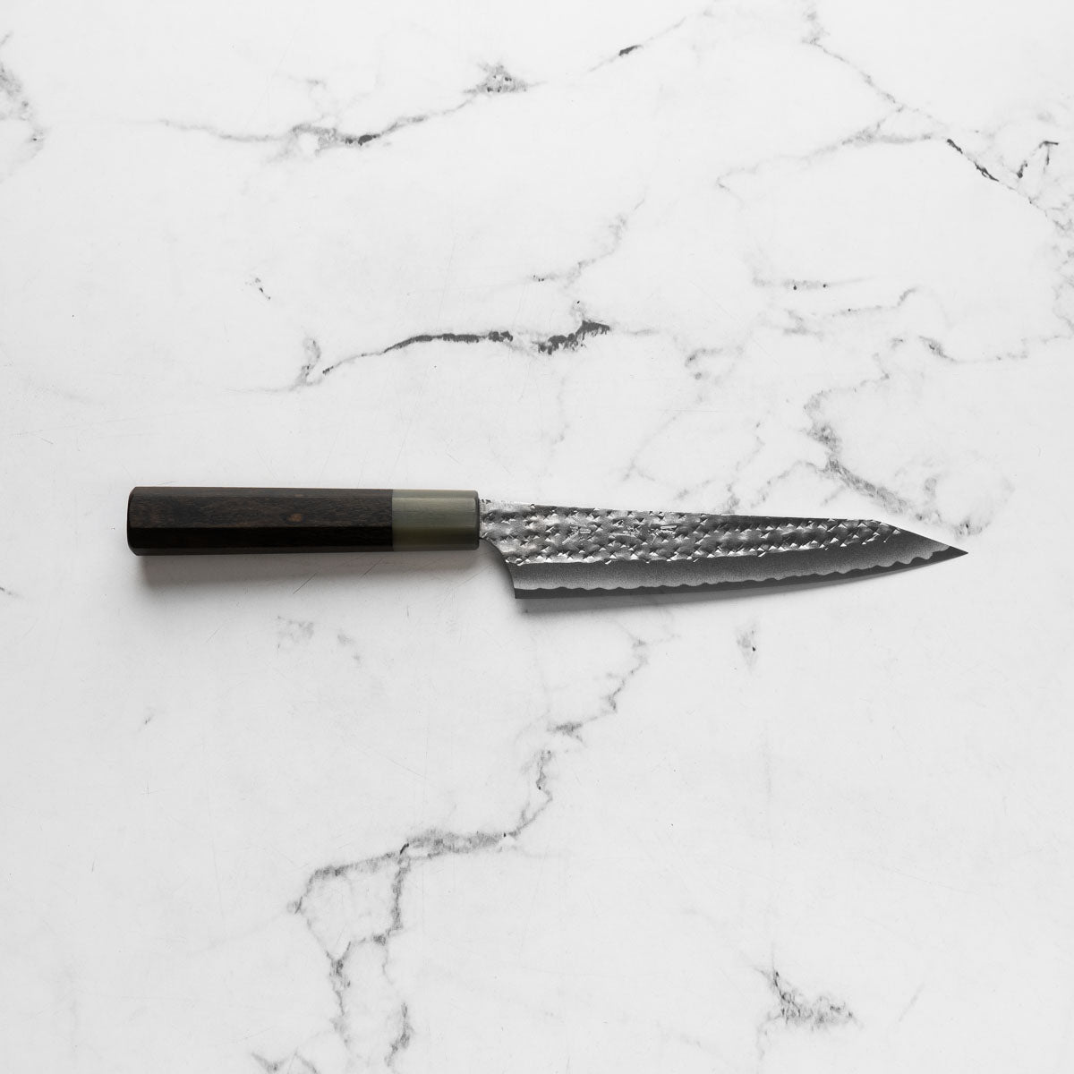 His knives are instantly recognizable for their striking Tsuchime and Suminagashi finishes, thin grinds, and use of high-performance steels such as SG2, HAP40, and stainless-clad Blue Super. Kurosaki’s Fujin series, with its dramatic wind-patterned hammer finish, helped cement his reputation as a blacksmith who blends artistry and technical brilliance in equal measure.