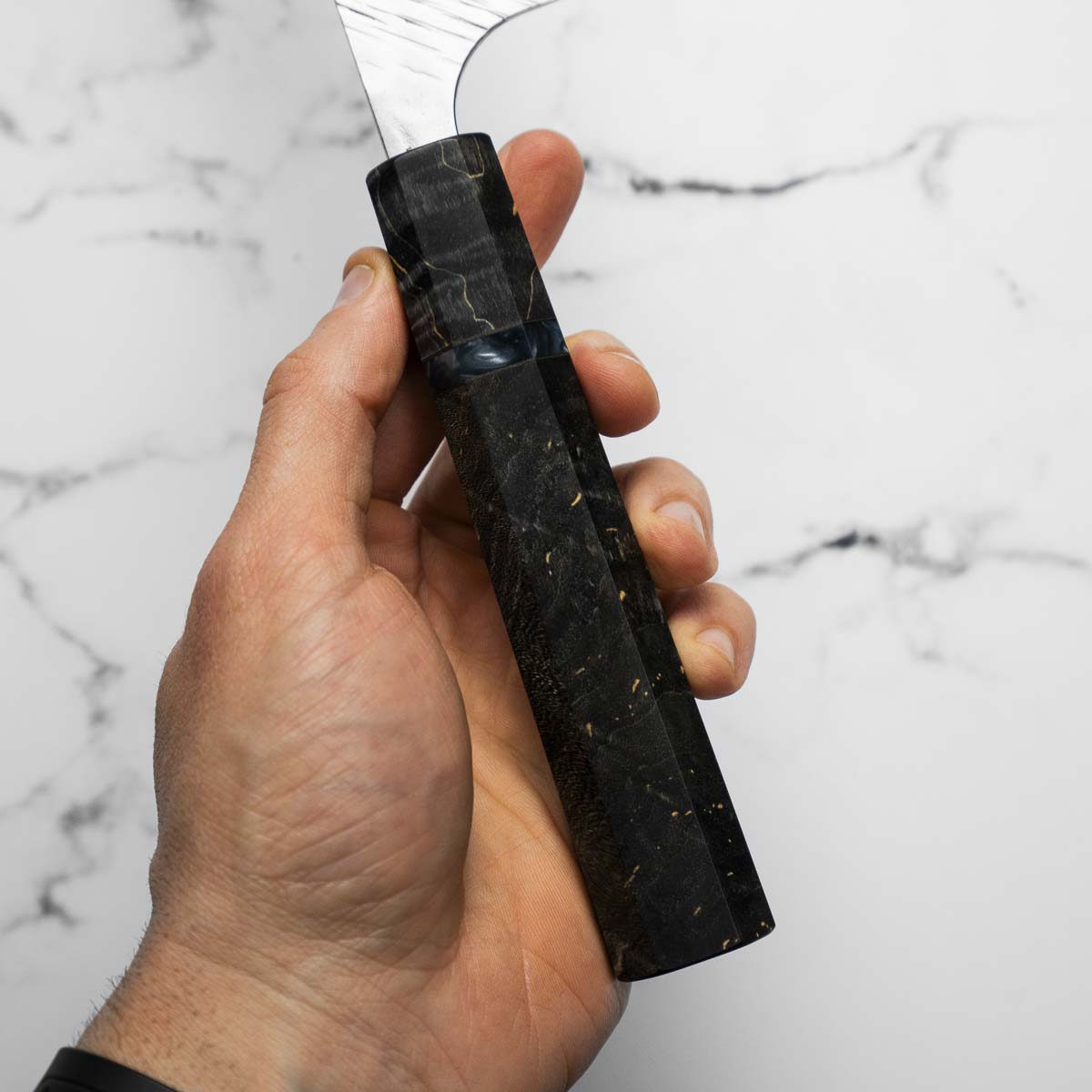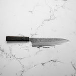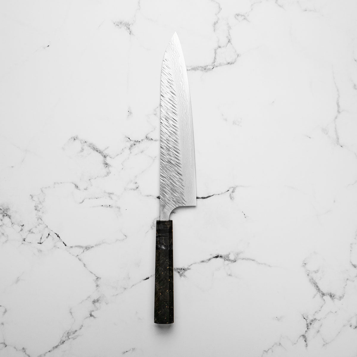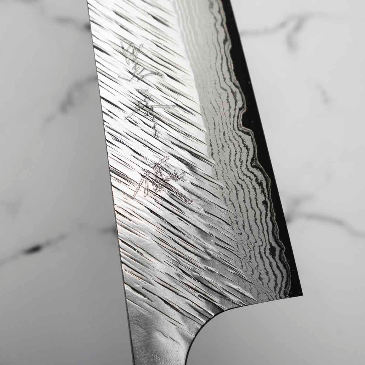 His knives are instantly recognizable for their striking Tsuchime and Suminagashi finishes, thin grinds, and use of high-performance steels such as SG2, HAP40, and stainless-clad Blue Super. Kurosaki’s Fujin series, with its dramatic wind-patterned hammer finish, helped cement his reputation as a blacksmith who blends artistry and technical brilliance in equal measure.