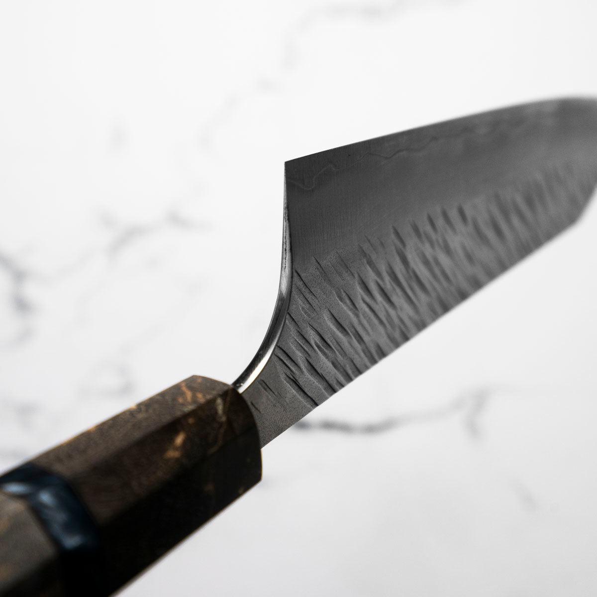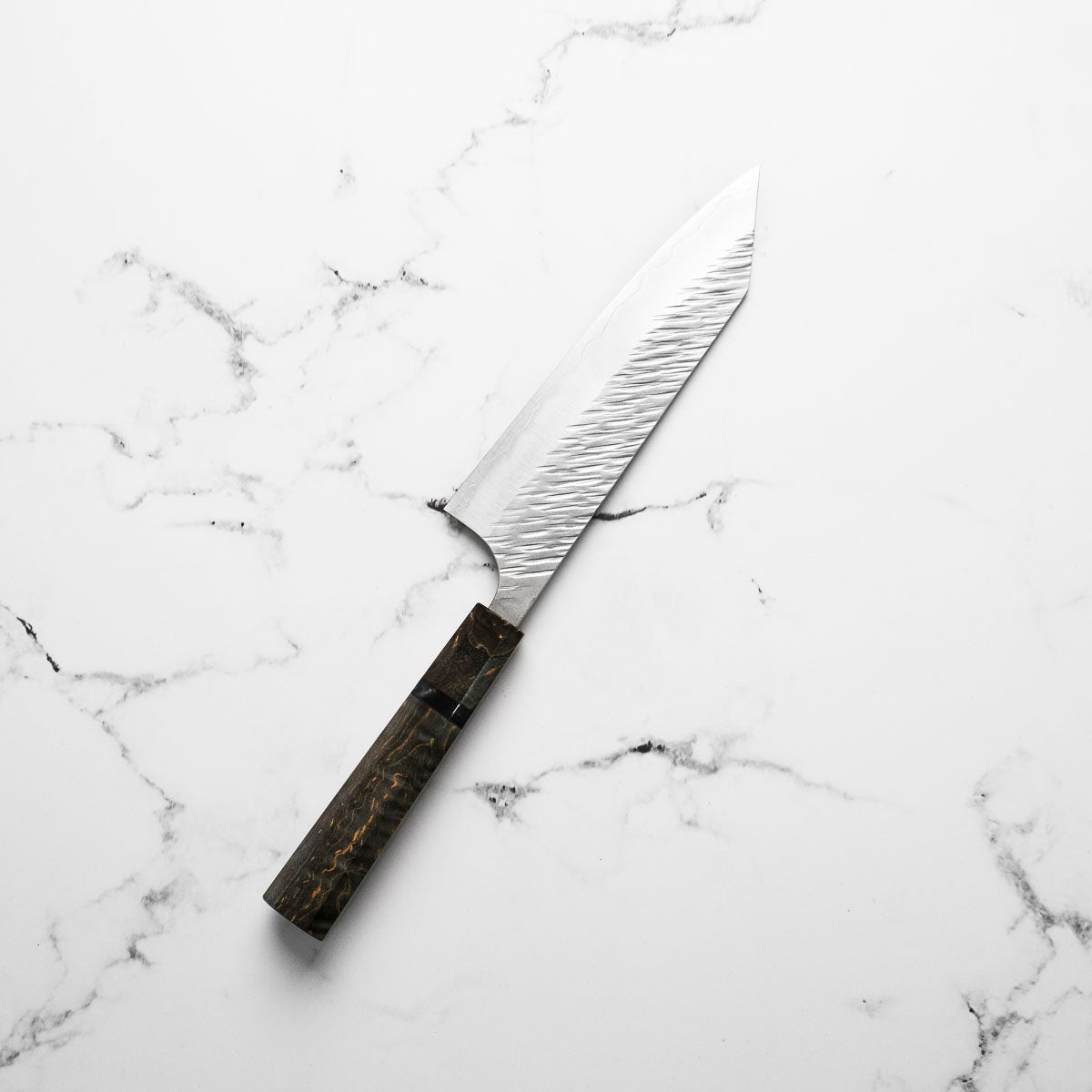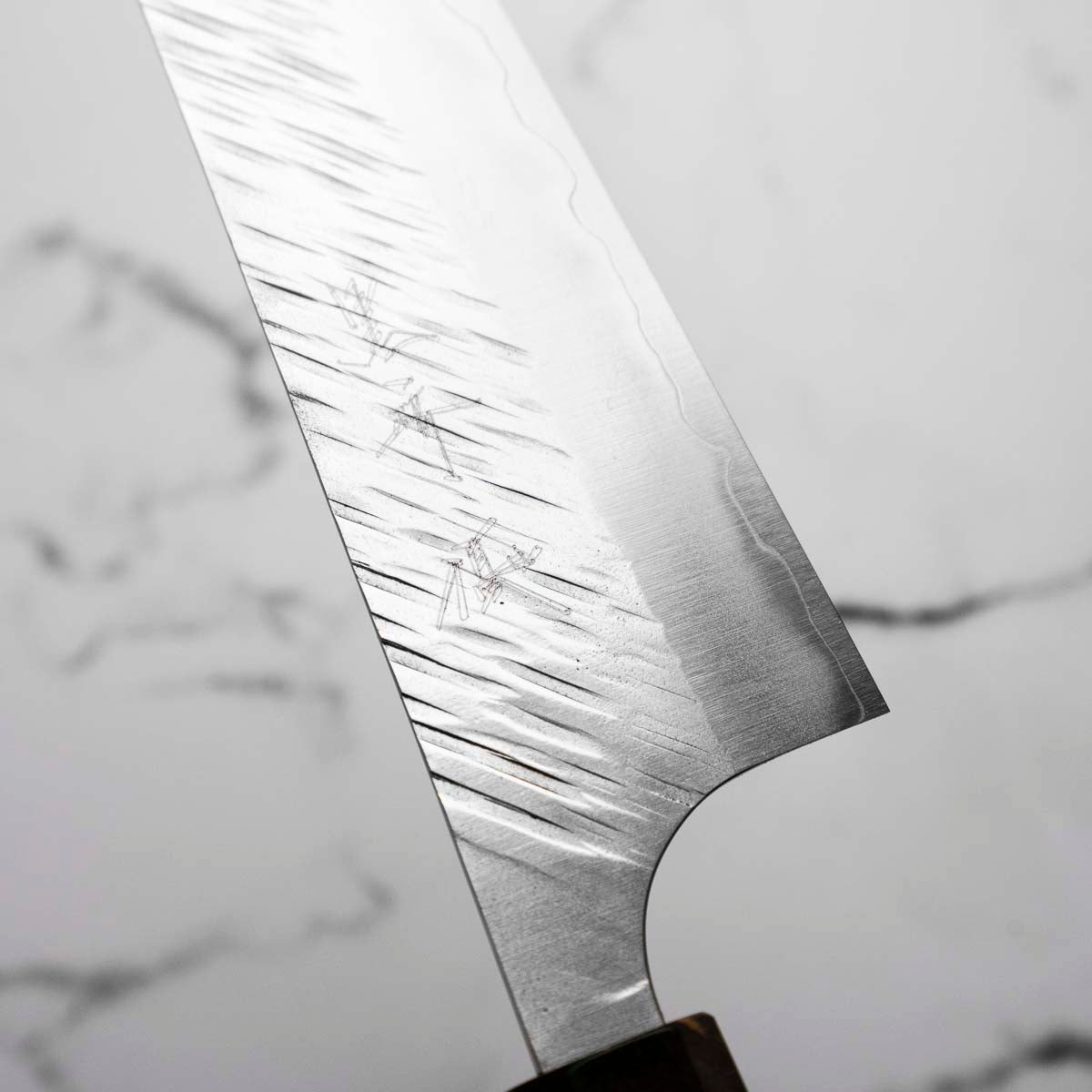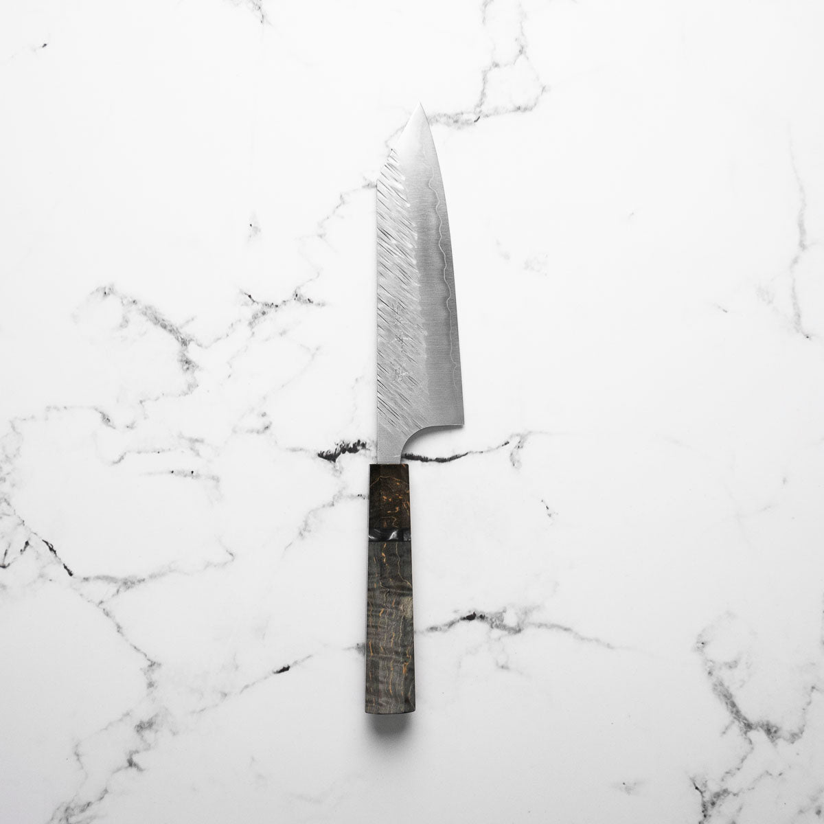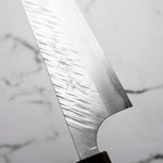 His knives are instantly recognizable for their striking Tsuchime and Suminagashi finishes, thin grinds, and use of high-performance steels such as SG2, HAP40, and stainless-clad Blue Super. Kurosaki’s Fujin series, with its dramatic wind-patterned hammer finish, helped cement his reputation as a blacksmith who blends artistry and technical brilliance in equal measure.