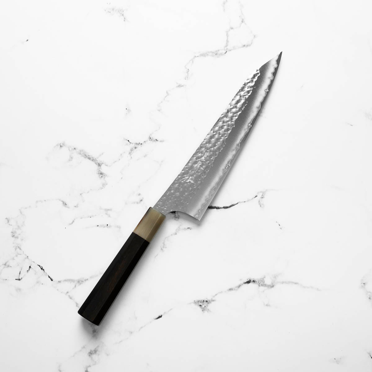 His knives are instantly recognizable for their striking Tsuchime and Suminagashi finishes, thin grinds, and use of high-performance steels such as SG2, HAP40, and stainless-clad Blue Super. Kurosaki’s Fujin series, with its dramatic wind-patterned hammer finish, helped cement his reputation as a blacksmith who blends artistry and technical brilliance in equal measure.