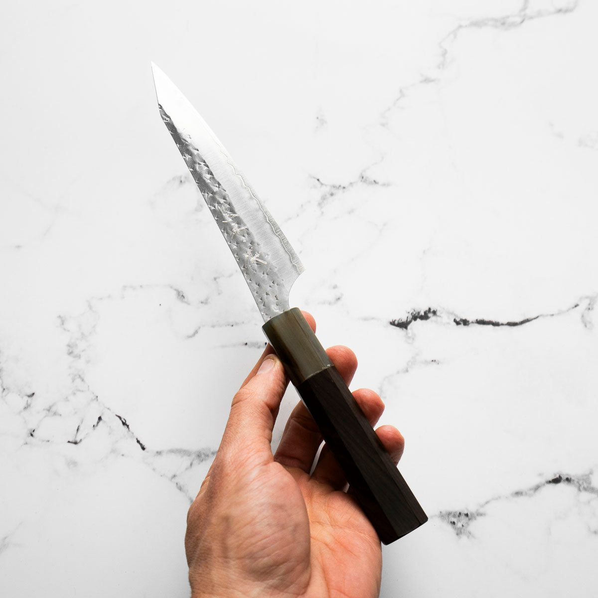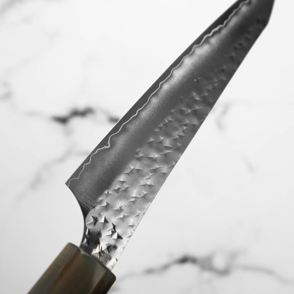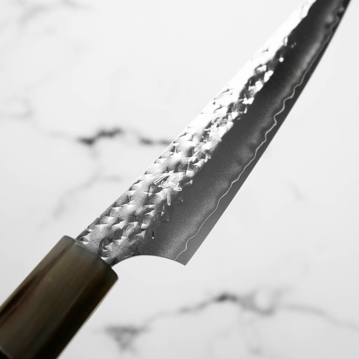 His knives are instantly recognizable for their striking Tsuchime and Suminagashi finishes, thin grinds, and use of high-performance steels such as SG2, HAP40, and stainless-clad Blue Super. Kurosaki’s Fujin series, with its dramatic wind-patterned hammer finish, helped cement his reputation as a blacksmith who blends artistry and technical brilliance in equal measure.