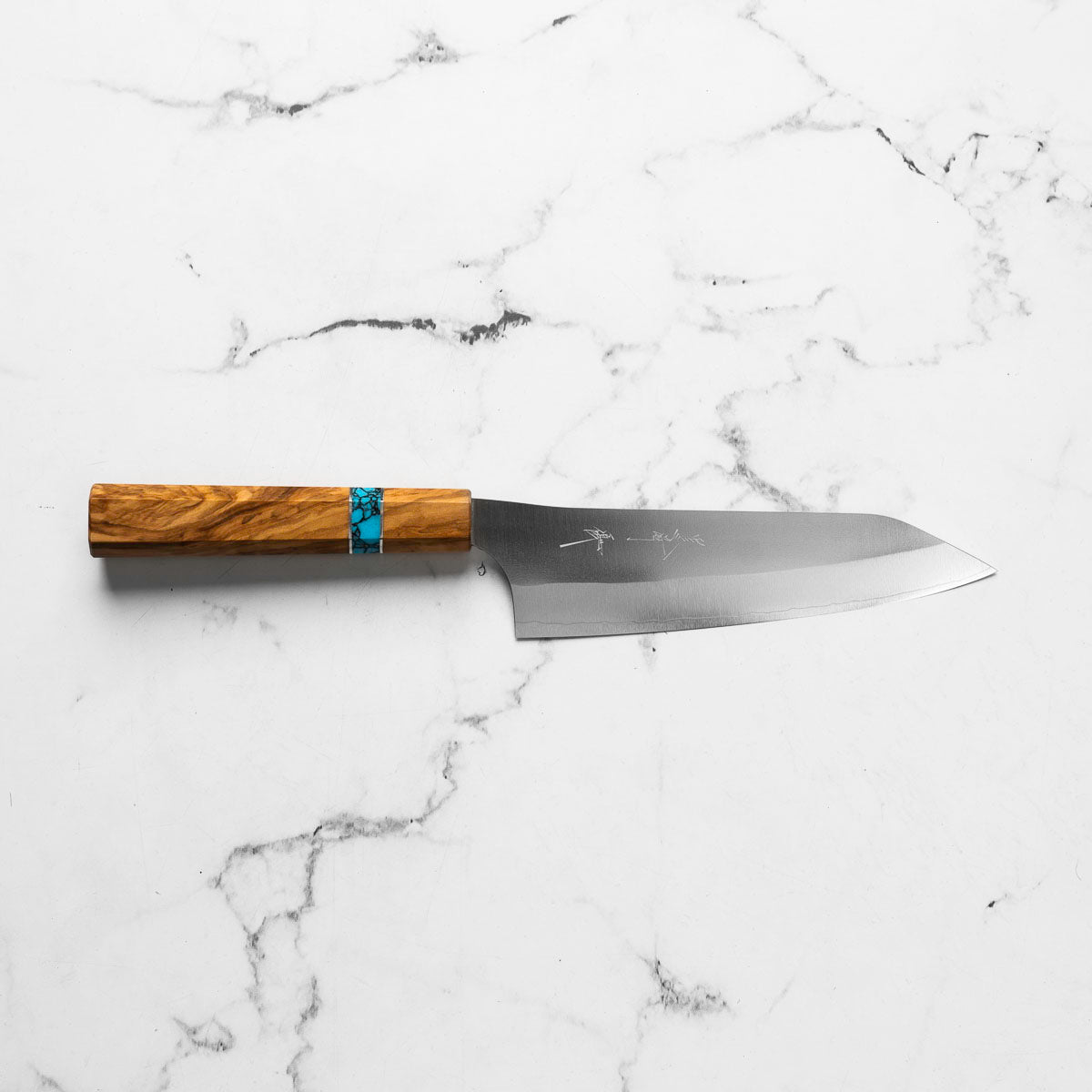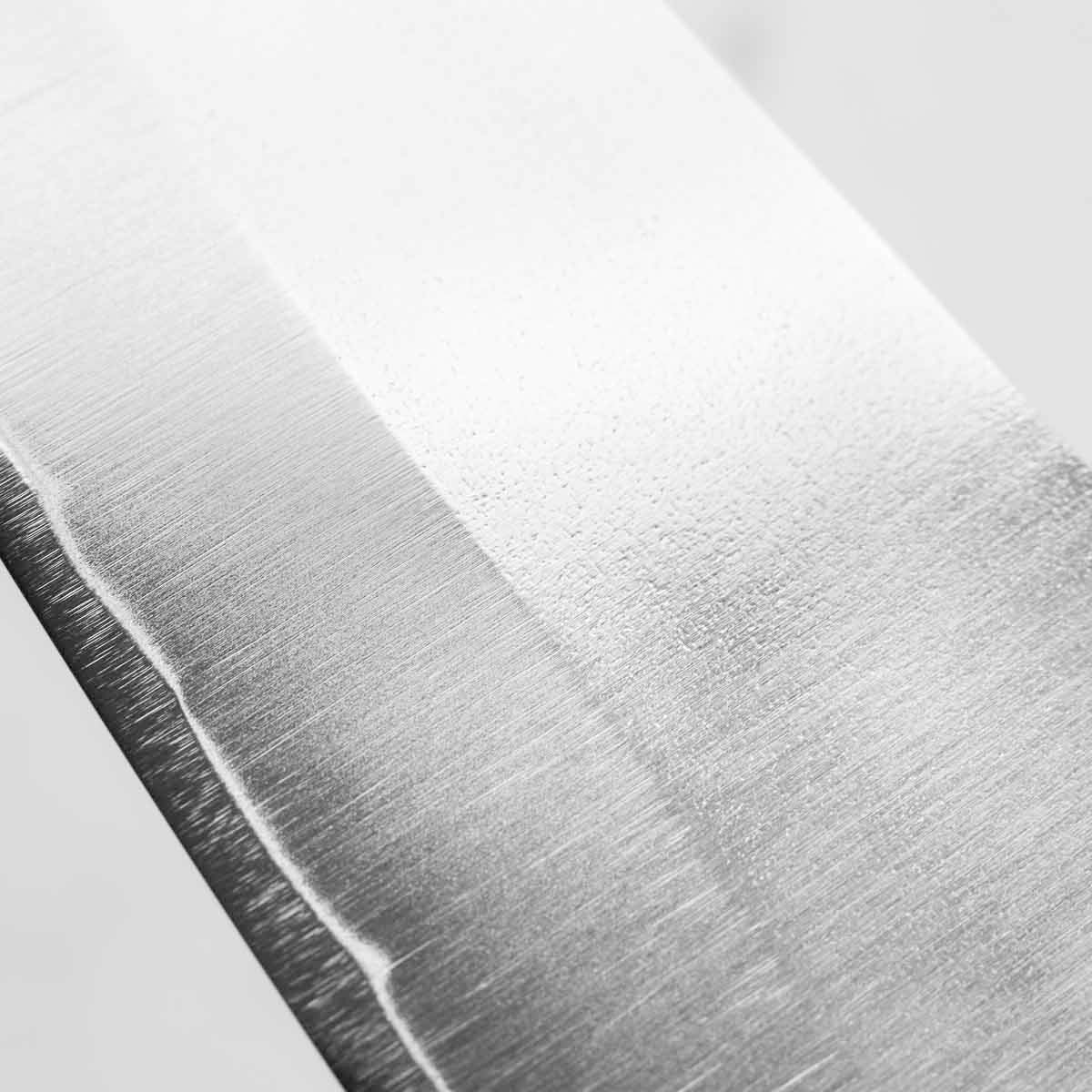 His knives are instantly recognizable for their striking Tsuchime and Suminagashi finishes, thin grinds, and use of high-performance steels such as SG2, HAP40, and stainless-clad Blue Super. Kurosaki’s Fujin series, with its dramatic wind-patterned hammer finish, helped cement his reputation as a blacksmith who blends artistry and technical brilliance in equal measure.