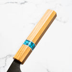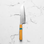 His knives are instantly recognizable for their striking Tsuchime and Suminagashi finishes, thin grinds, and use of high-performance steels such as SG2, HAP40, and stainless-clad Blue Super. Kurosaki’s Fujin series, with its dramatic wind-patterned hammer finish, helped cement his reputation as a blacksmith who blends artistry and technical brilliance in equal measure.