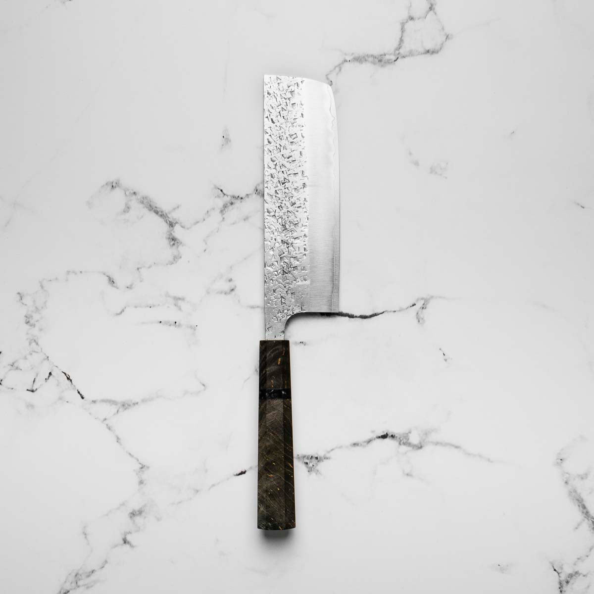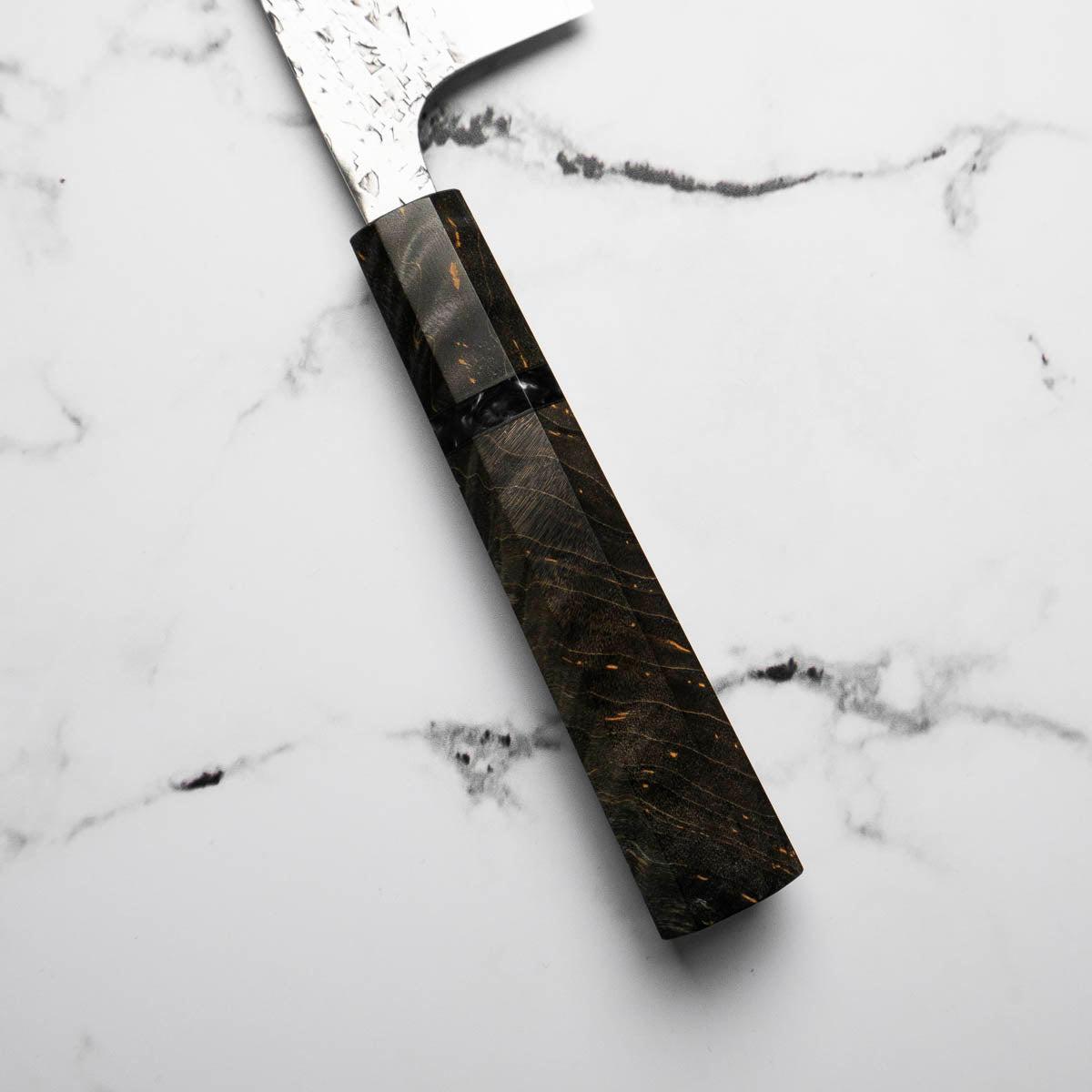 His knives are instantly recognizable for their striking Tsuchime and Suminagashi finishes, thin grinds, and use of high-performance steels such as SG2, HAP40, and stainless-clad Blue Super. Kurosaki’s Fujin series, with its dramatic wind-patterned hammer finish, helped cement his reputation as a blacksmith who blends artistry and technical brilliance in equal measure.