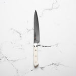 The Petty knife, a quintessential tool in Japanese cuisine, is a smaller utility knife used for precise, delicate tasks. Often considered a smaller sibling to the chef's knife, it excels in hand-held tasks like peeling, trimming, and intricate cutting. Its versatility makes it an essential for detailed culinary work.
