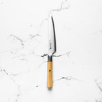 This knife is made from a high-carbon steel and as such, will require a little more care than a regular off-the-shelf knife. It must be dried shortly after use, as prolonged exposure to moisture can cause rust spots to appear. A very light coat of oil during storage also helps to prevent rust spots. A patina (coloration and seasoning of the steel) will occur with use.