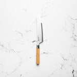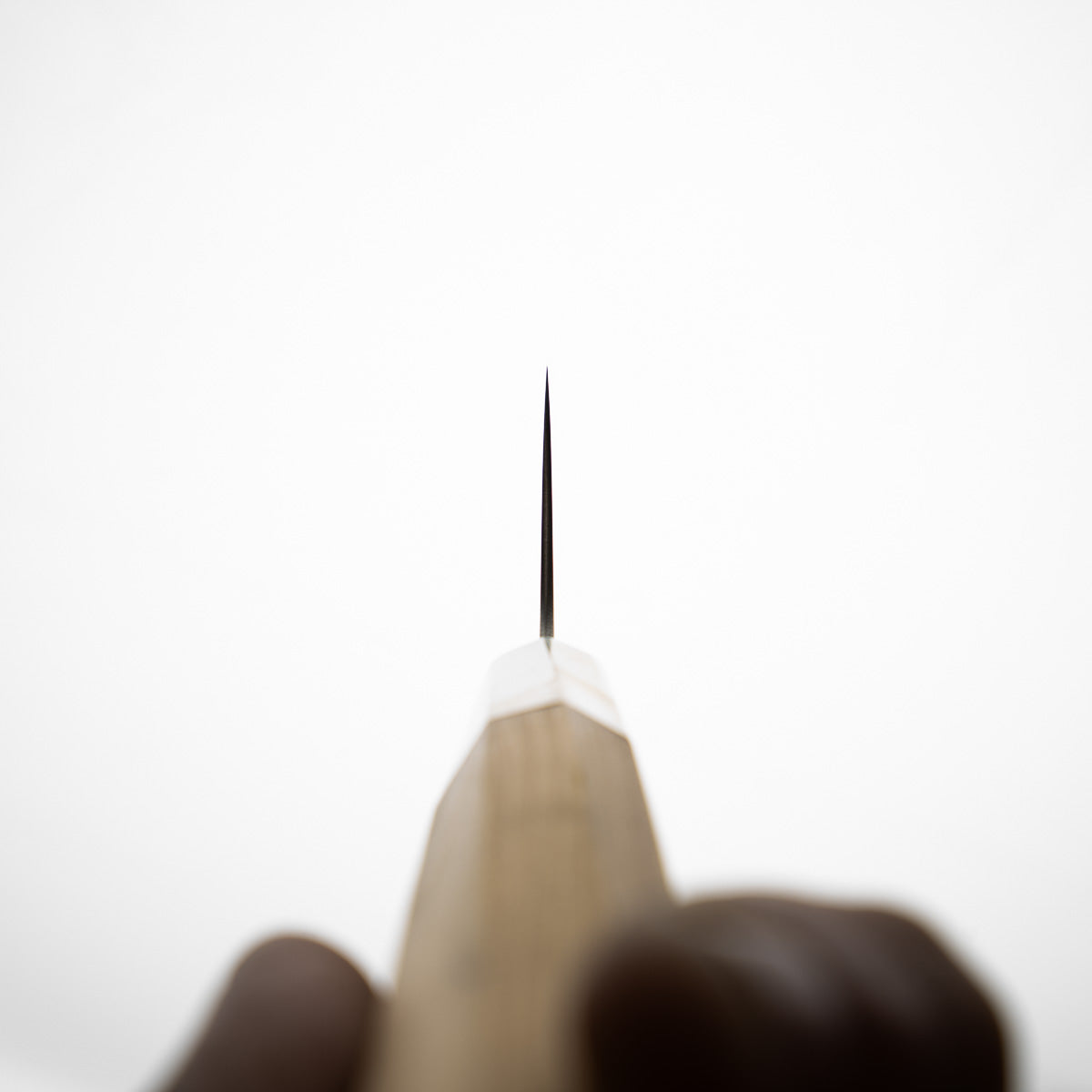 This knife is made from a high-carbon steel and as such, will require a little more care than a regular off-the-shelf knife. It must be dried shortly after use, as prolonged exposure to moisture can cause rust spots to appear. A very light coat of oil during storage also helps to prevent rust spots. A patina (coloration and seasoning of the steel) will occur with use.